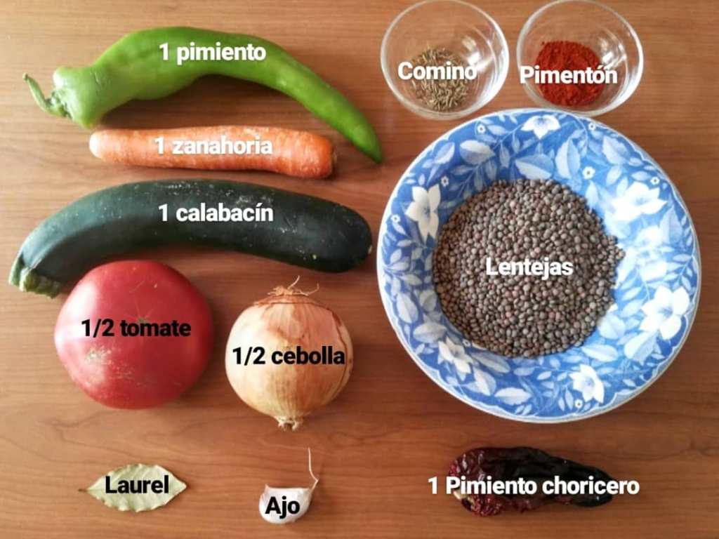 🔹60 g de lentejas secas. 🔹1 pimiento verde. 🔹1 calabacín. 🔹1 zanahoria. 🔹1/2 cebolla. 🔹1/2 tomate. 🔹1 cabeza de ajo. 🔹1 hoja de laurel. 🔹1 pimiento choricero. 🔹Comino en polvo y pimentón de la Vera.
